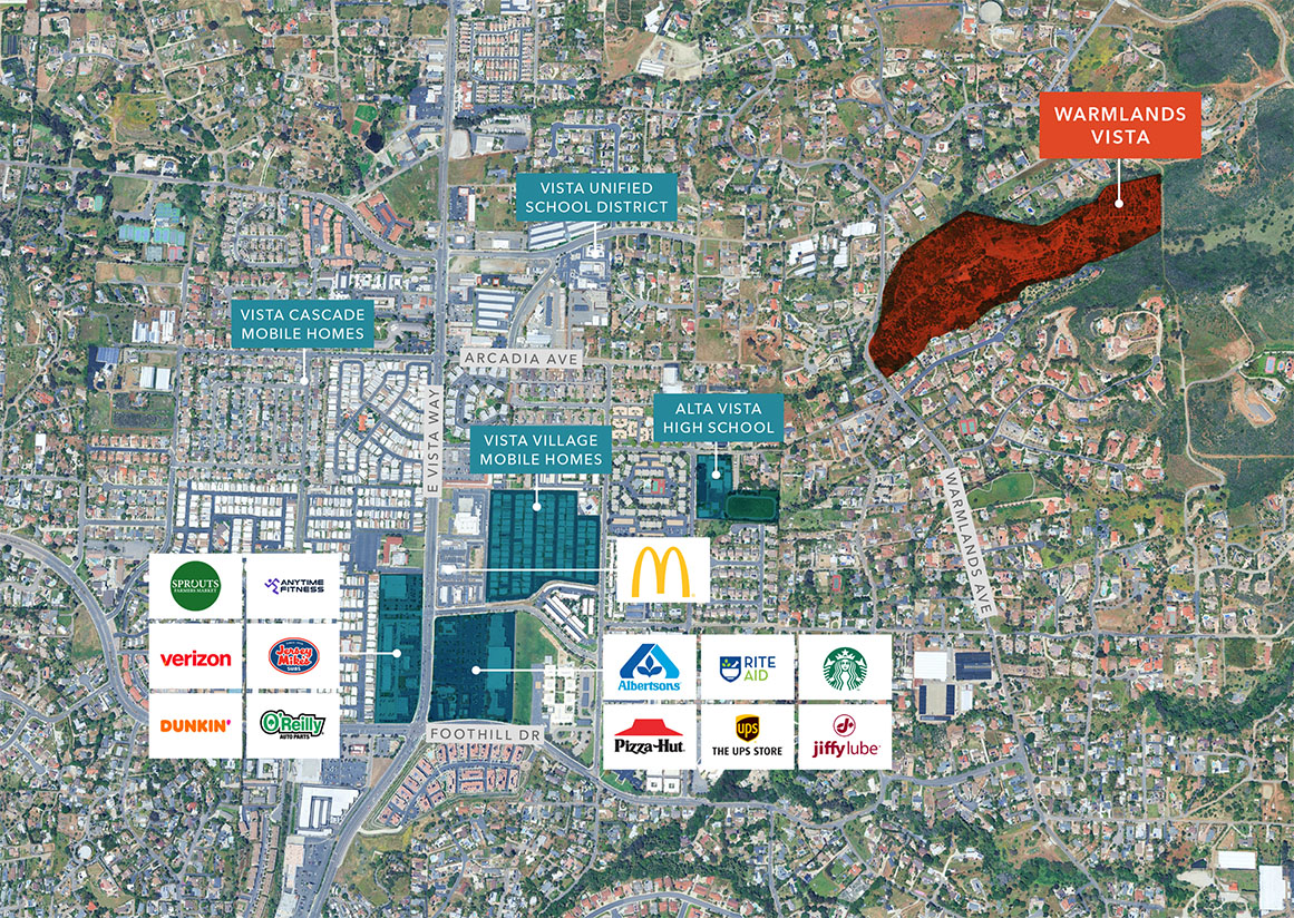 Vista is located about 7 miles inland with convenient access to SR‑78, I‑5, and I‑15 and nearby employment centers.